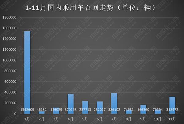 整体来看,11月国内乘用车召回规模显著回弹,召回数量环比上月翻了三倍,成为年内第四高点。通过前11个月趋势来看,乘用车召回市场依旧呈现高开低走的态势,1月一举召回超过154万辆乘用车后,规模迅速回落并始终保持在相对低位;1-11月累计召回数量同比下降超50%。