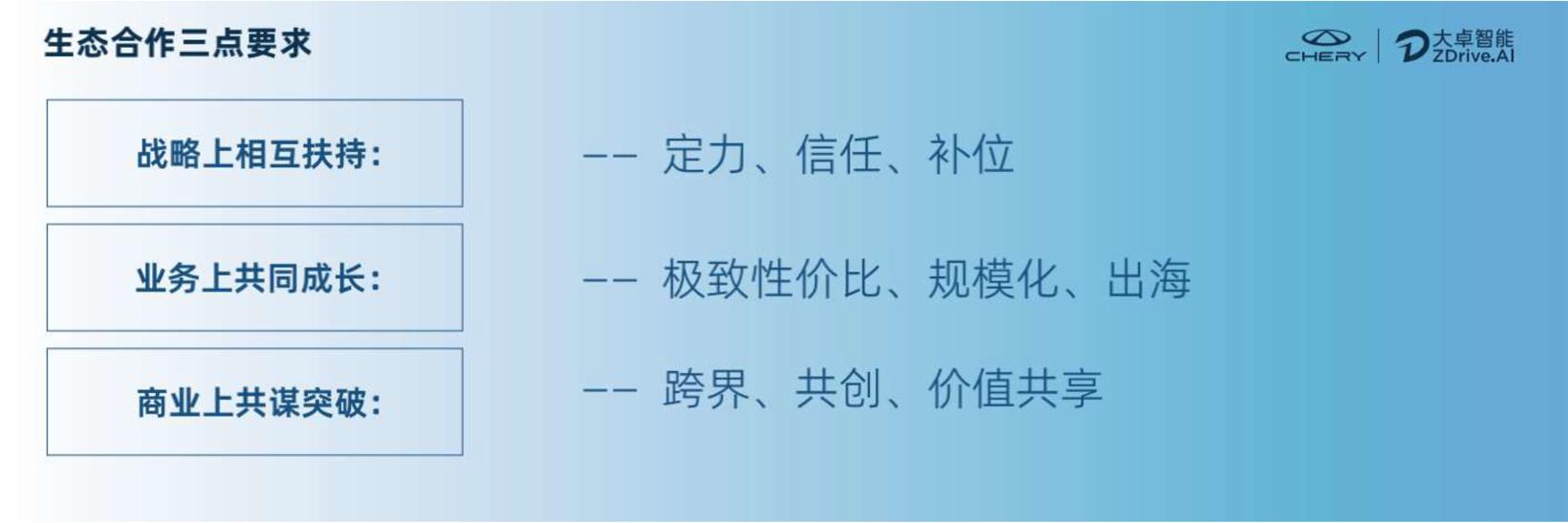 不久前,大卓智能生态日暨2024卓界大会上,奇瑞汽车股份有限公司副总经理、大卓智能总经理谷俊丽就强调,大卓智能定位是自动驾驶解决方案公司和集成平台,车企要对自动驾驶技术栈有所掌控,但不一定要求全栈自研。任何一个产业要实现产业化,一定要求生态协同,自研是一个非常庞大的工程。