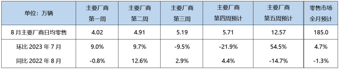 按周度来看,受7月底8月初华北、东北等地局部极端降雨天气影响,8月第一周主要厂商日均零售4.01万,同比微降0.8%;第二周起,车市逐渐恢复,部分受极端天气压抑的需求释放,日均零售4.91万,同比增长12.6%;第三周,车市增速放缓,日均零售5.19万,同比增长2.9%;各地“818购车节”后终端开始交付,第四周车市热度预计略有提升,日均零售预计为6.07万,同比增长4.4%;第五周日均零售预计12.82万,较去年同期下降14.7%。