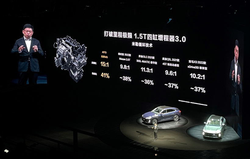 AITO问界M5搭载了华为DriveONE纯电驱增程平台,1.5T四缸增程器3.0,拥有15:1最高压缩比,41%的高热效率,以及3.2kW·h/L 的最大发电效率,满油满电情况下车辆可实现CLTC工况续航1242公里。