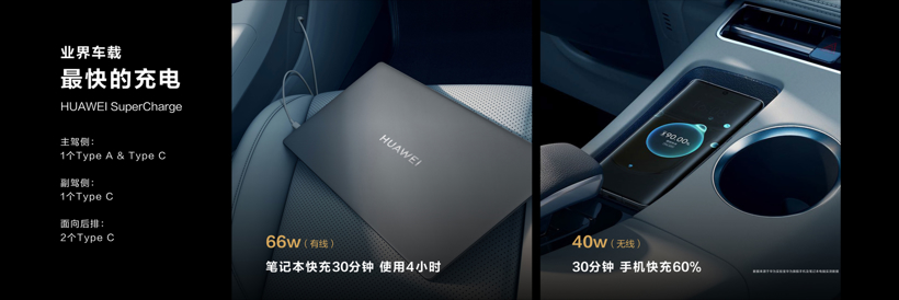 最后,作为华为手机能力的输出,首款鸿蒙汽车还有SuperCharge快充技术加持。分别使用40W无线快充和66W有线快充充电30分钟,手机可充至60%,笔记本快充可使用4个小时。