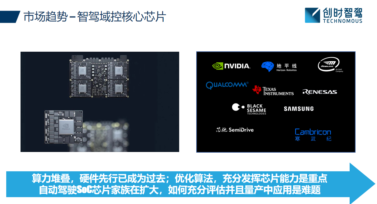 从智驾域控核心芯片角度看一下市场的趋势,左边这张图是业内某主机厂采用的预控域控硬件,据了解,不止配备在最高车型上,其他车型上也采用了这样的预控域控硬件,这不可避免会造成较高的成本。然而我们看到今年以来,算力堆叠,硬件先行已成为过去式,优化算法、充分发挥芯片能力成为重点。