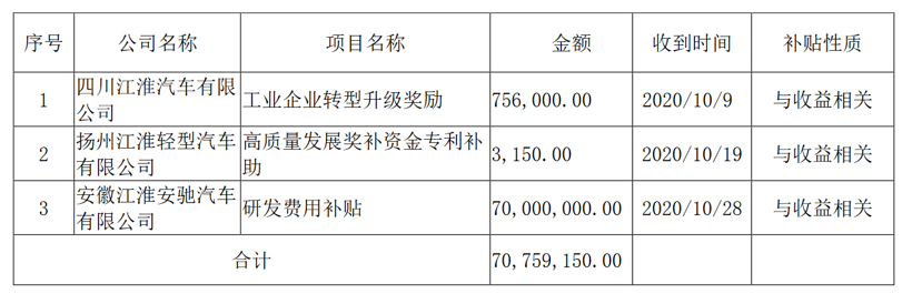 江淮汽车在公告中表示:“公司及控股子公司对上述补助资金在2020年度计入当期损益,将对公司2020年度的利润产生积极影响。”