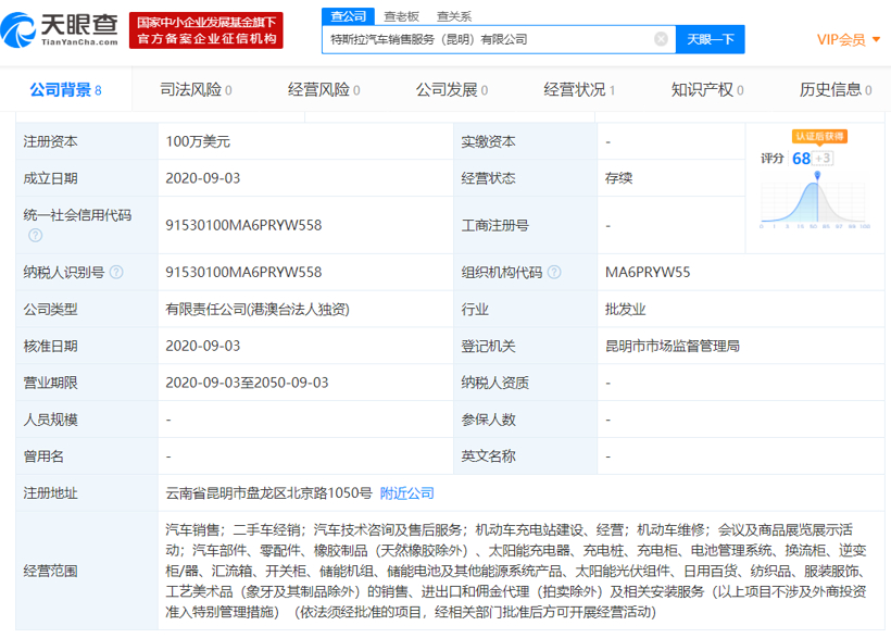 特斯拉汽车销售服务(昆明)有限公司相关信息;图片来源:天眼查截图